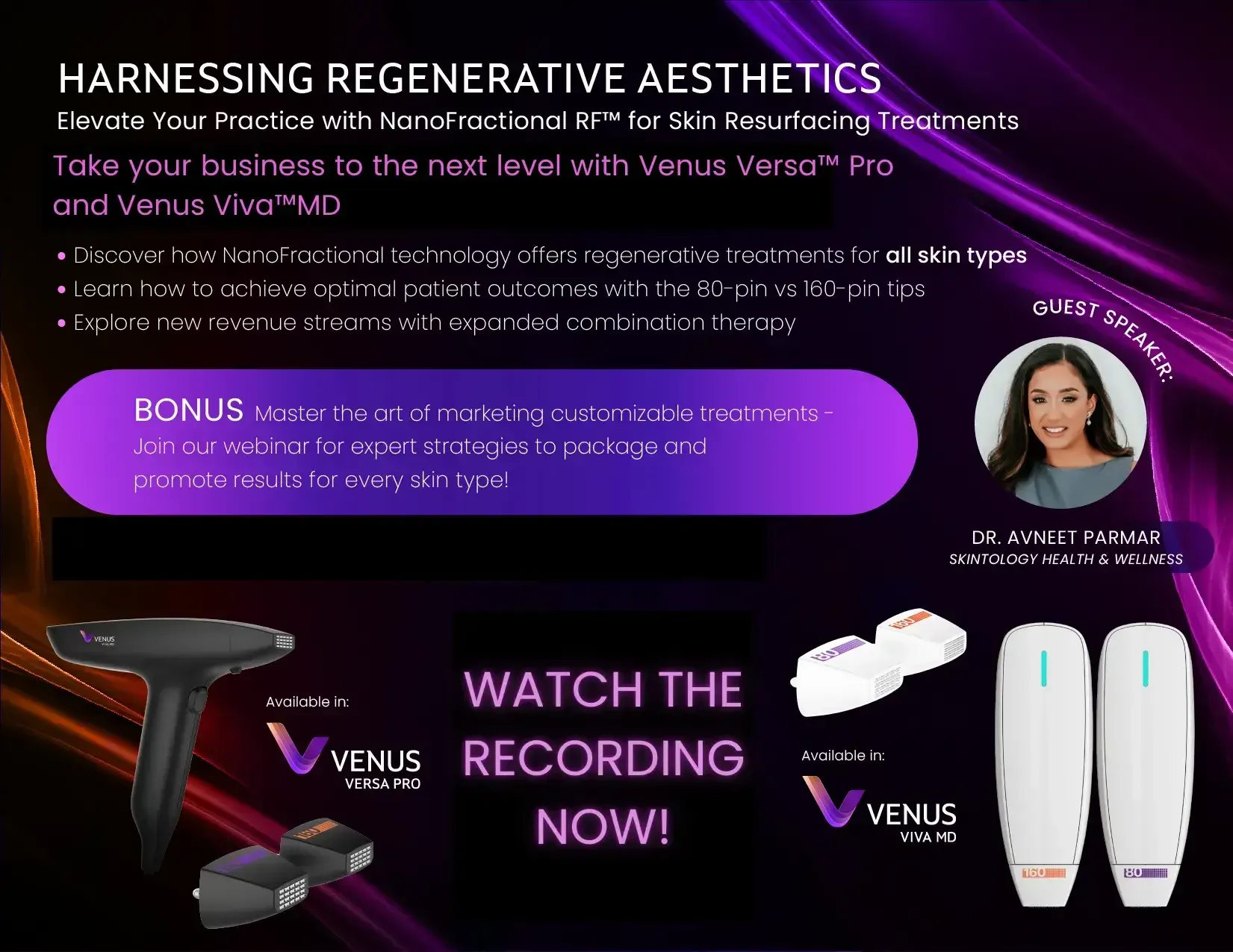 Watch our latest webinar recording: Harnessing Regenerative Aesthetics: Elevate Your Practice with NanoFractional RF Skin Resurfacing Treatments, to gain valuable insights from our special guest speaker Dr. Parmar.